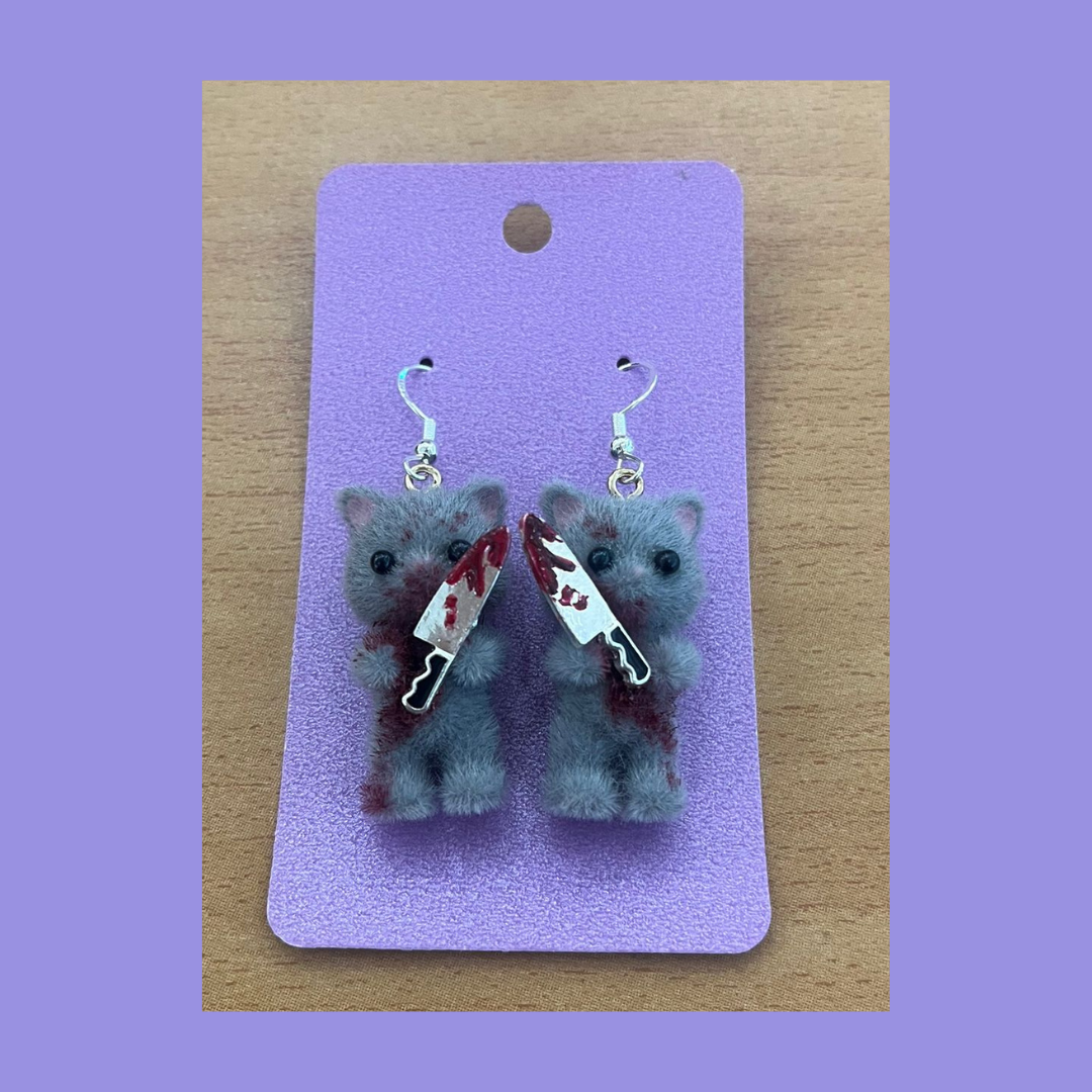 "Unleash your killer style with these earrings featuring kittens holding knifes (but don't worry, they're harmless)! Make a bold statement and show off your quirky side with these playful accessories."