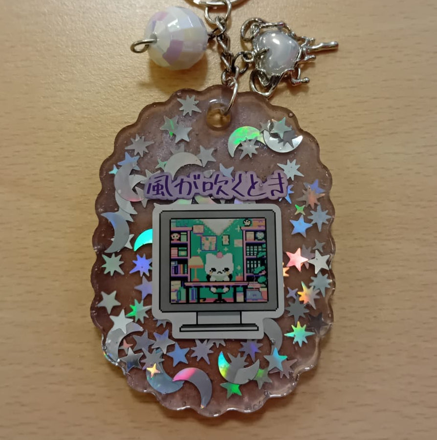 Experience a purr-fect accessory with our "When the Wind Blows" keychain! This kawaii keychain features a grey design with holographic star glitter and a cute computer kitten. It's the purr-fect way to add a touch of whimsy to your keys or bag. Meow-velous!